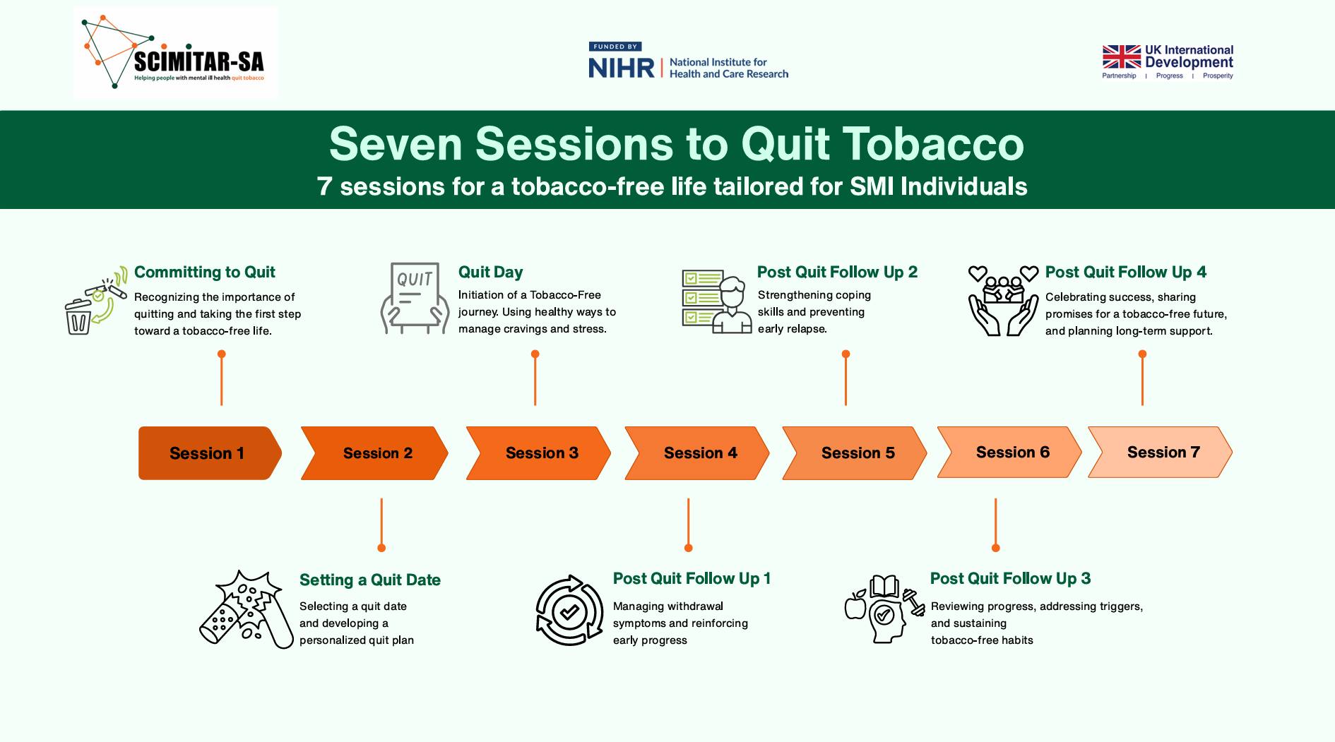 A tobacco cessation intervention designed for individuals with Severe Mental Illness (SMI). The 7-session pathway supports readiness to quit, coping with cravings, personalised quit planning, relapse prevention, and continuous follow-up.