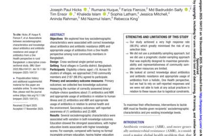 In rural Bangladesh, we are currently evaluating the effectiveness of a community-led engagement programme aimed at improving awareness and correct knowledge about antibiotics and ABR and appropriate usage of antibiotics from a One Health perspective via a cluster randomised controlled trial. The 12-month-long community engagement programme, known as the community dialogue approach, addresses many issues related to antimicrobials and AMR from a One Health perspective, focusing on antimicrobials and AMR in relation to humans, animals and the environment. For our trial, we have conducted a (pre-intervention) baseline household survey in Cumilla district, Bangladesh. The eventual primary use of this baseline data will be to increase precision and reduce bias in our effectiveness analyses that will use our (post-intervention) endline data.
