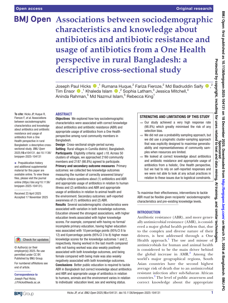Studies from other LMICs focusing on the public have found important associations between sociodemographic characteristics, such as education levels and sex, and levels of knowledge about antibiotics and ABR (eg, references21–23). These findings can help inform the targeting and focus of community-focused public health efforts aimed at tackling antibiotic/AMR (such as educational and engagement interventions). Therefore, here we aim to understand what associations exist between key sociodemographic characteristics and levels of correct knowledge and awareness relating to antibiotics and ABR and appropriate antibiotic usage from a One Health perspective, within the general rural Bangladeshi population.