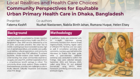 Find the PDF here or Read HTML version ARK Foundation has participated in different segments at the International Conference on Urban Health (ICUH) 2025, Wellington, New Zealand. An oral presentation on “Understanding Access to Primary Healthcare in Dhaka’s Urban Slums: A Qualitative Inquiry into Community Perceptions and Health Equity Challenges”, authored by our Senior Research Assistant, Nabila