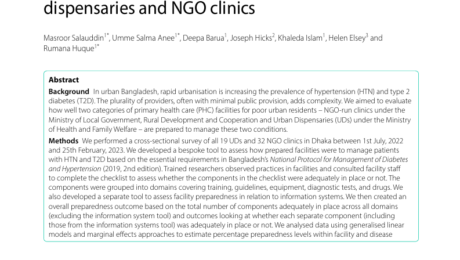 Find the article here or download the PDF version Abstract Background In urban Bangladesh, rapid urbanisation is increasing the prevalence of hypertension (HTN) and type 2 diabetes (T2D). The plurality of providers, often with minimal public provision, adds complexity. We aimed to evaluate how well two categories of primary health care (PHC) facilities for poor