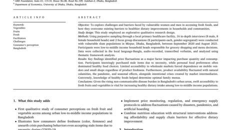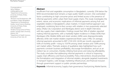 Find it here or download the PDF version Abstract Insufficient fruit and vegetable consumption in Bangladesh, currently 25% below the WHO-recommended level remains a major public health concern. One overlooked factor contributing to high consumer prices and limited access is the presence of informal payments within urban fresh food supply chains. This study investigates