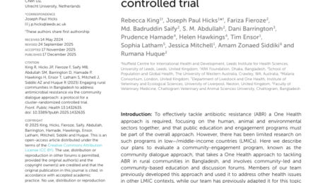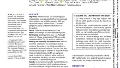 Find the article here or download the PDF version Abstract Objectives We explored how key sociodemographic characteristics were associated with correct knowledge about antibiotics and antibiotic resistance (ABR) and appropriate usage of antibiotics from a One Health perspective among rural community members in Bangladesh. Design Cross-sectional single-period survey. Setting Rural villages in Cumilla district, Bangladesh. Participants Eligibility criteria: aged