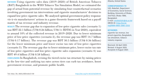 Read the article here or download the PDF version ABSTRACT Introduction: In Bangladesh, a significantly lower minimum retail price and preferential ad valorem tax rate for low-price cigarettes incentivized manufacturers to avoid tax by expanding the low-price cigarettes market. The effect of this industry response on government tax revenue has not been quantified yet. This