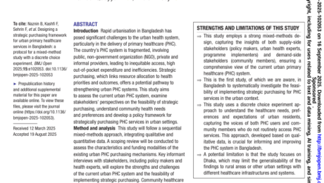 Find the article here or download PDF version Abstract Introduction Rapid urbanisation in Bangladesh has posed significant challenges to the urban health system, particularly in the delivery of primary healthcare (PHC). The country’s PHC system is fragmented, involving public, non-government organization (NGO), private and informal providers, leading to inequitable access, high out-of-pocket expenditure and inefficiencies. Strategic