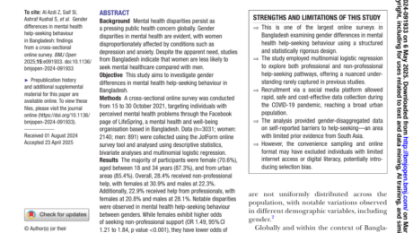Read the article here or download PDF version Abstract Background Mental health disparities persist as a pressing public health concern globally. Gender disparities in mental health are evident, with women disproportionately affected by conditions such as depression and anxiety. Despite the apparent need, studies from Bangladesh indicate that women are less likely to seek mental healthcare