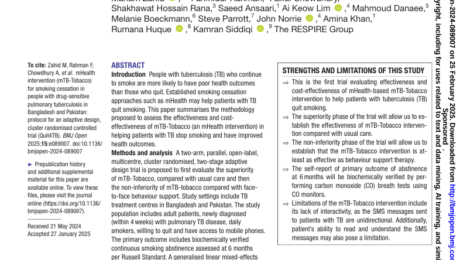 Read the article here or download the PDF version Abstract Introduction People with tuberculosis (TB) who continue to smoke are more likely to have poor health outcomes than those who quit. Established smoking cessation approaches such as mHealth may help patients with TB quit smoking. This paper summarises the methodology proposed to assess the effectiveness and