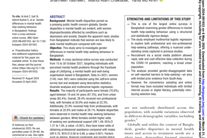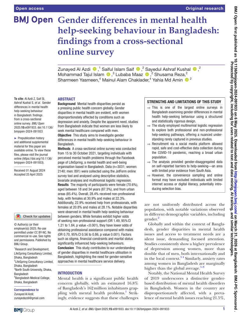 In conclusion, the study provides valuable insights into gender differences in mental health help-seeking behaviour in Bangladesh. By understanding the intricate interplay of socio-cultural, economic and individual factors influencing help-seeking behaviour, policymakers and healthcare providers can develop more inclusive and accessible mental health services that cater to the diverse needs of the population.