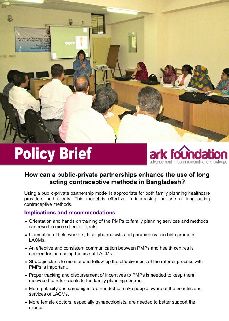 In Bangladesh, private medical practitioners (PMPs) provide family planning services, but are not involved in promoting and referring clients to family planning centres. We developed a public-private partnership (PPP) model to help PMPs implement a referral strategy between themselves and family planning centres. Our research assessed whether the PPP model was effective in increasing the use of LACMs and acceptable to both public and private healthcare providers.