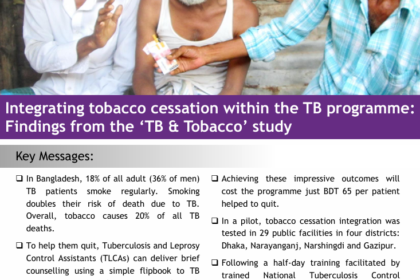 In a recently concluded trial in Bangladesh, we recruited 1527 TB patients who smoked on a regular basis. While they all received a brief (about 8 minutes) behavioural support session delivered by TB health workers, half also received a relatively cheap smoking-cessation drug ‘Cytisine’ while the other half received placebo. Approximately one-third of all TB patients that took part in the trial stopped smoking at 6 months.