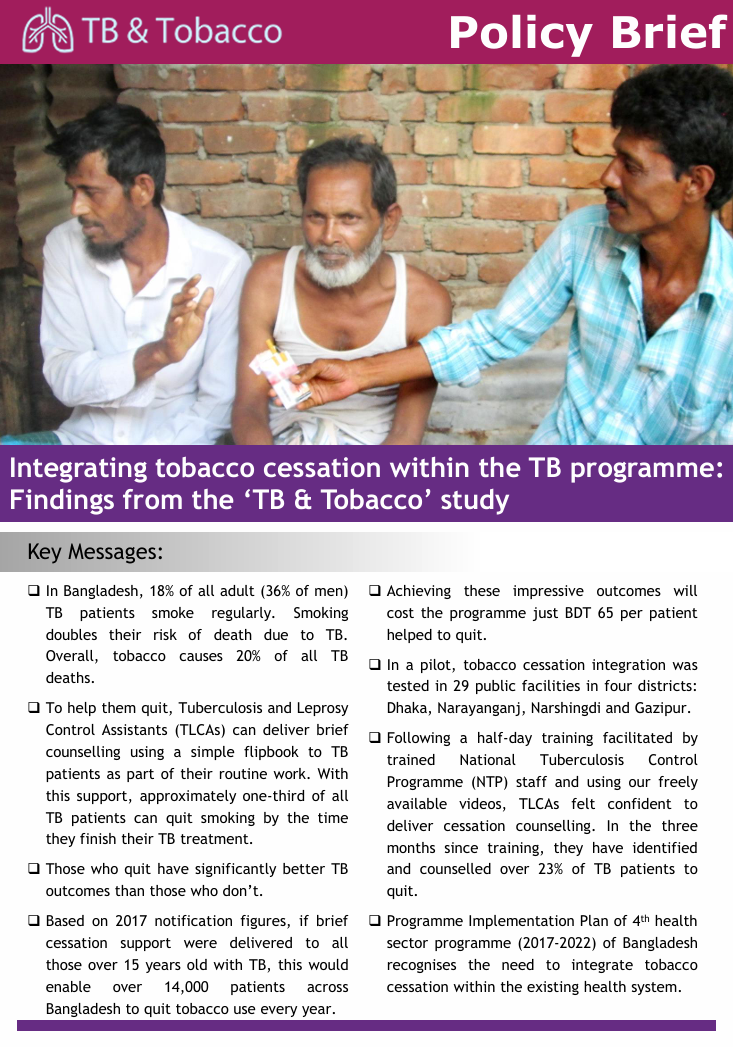 By helping people with TB to quit, TB health professionals can help their patients to recover from their TB, live healthier lives and reduce TB in Bangladesh.