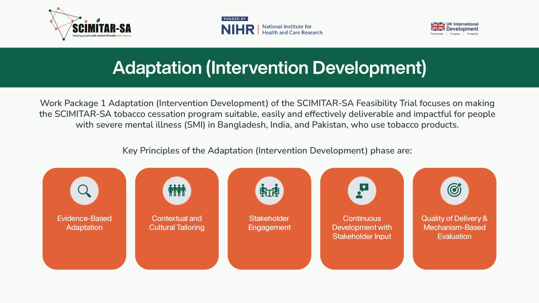 WP1 focuses on adapting the SCIMITAR-SA intervention to meet the cultural, contextual, and delivery needs of communities across South Asia. Stakeholder participation remains central in shaping an effective and accessible model for individuals with SMI.