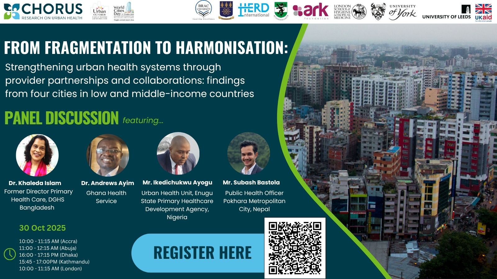 On October 30th, CHORUS successfully hosted the webinar and panel discussion titled “From Fragmentation to Harmonisation: Strengthening Urban Health Systems through Provider Partnerships and Collaboration.” The session explored how cities can build stronger and fairer health systems, particularly for underserved urban communities.