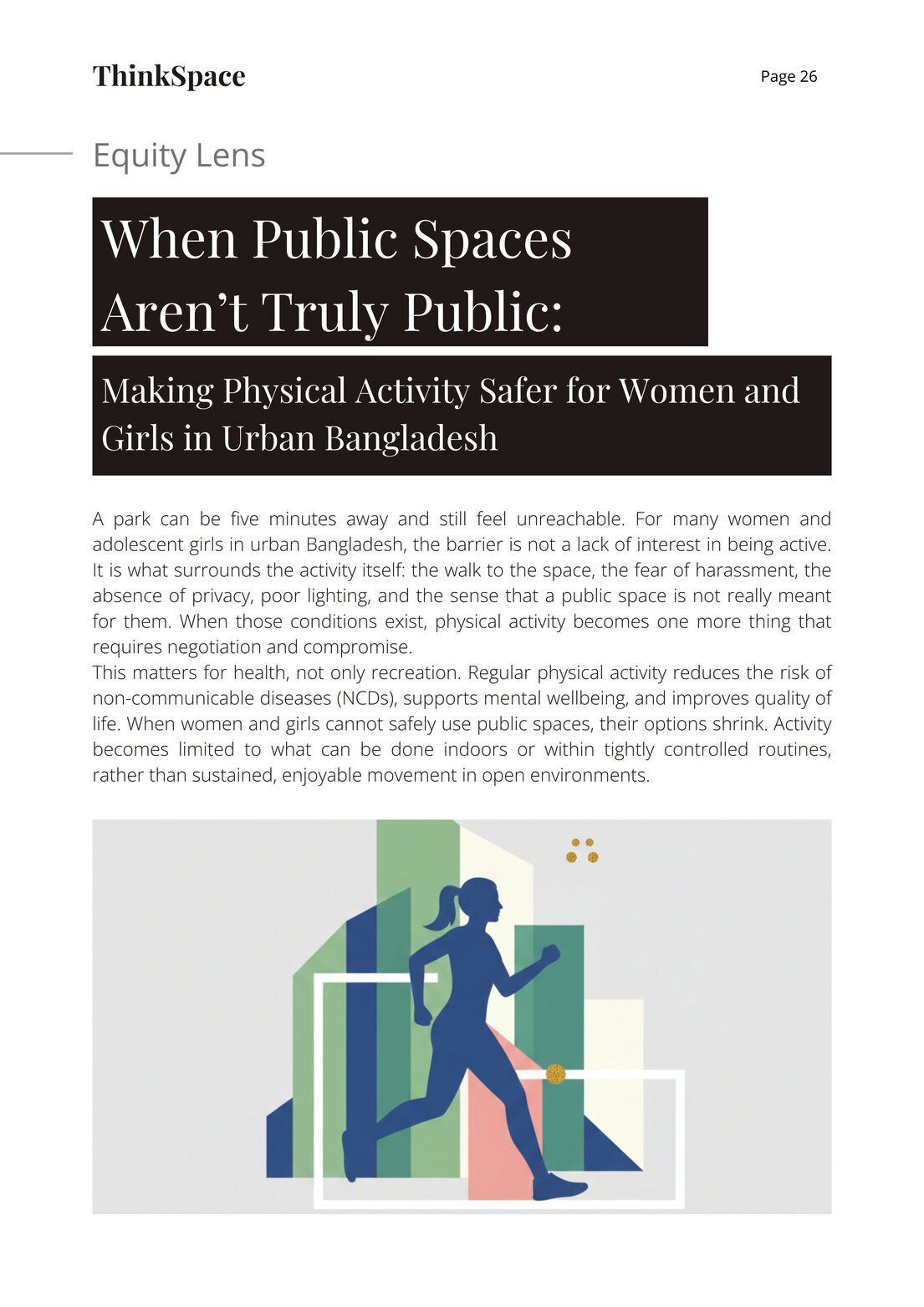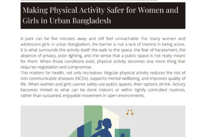 A park can be five minutes away and still feel unreachable. For many women and adolescent girls in urban Bangladesh, the barrier is not a lack of interest in being active. It is what surrounds the activity itself: the walk to the space, the fear of harassment, the absence of privacy, poor lighting, and the sense that a public space is not really meant for them. When those conditions exist, physical activity becomes one more thing that requires negotiation and compromise.